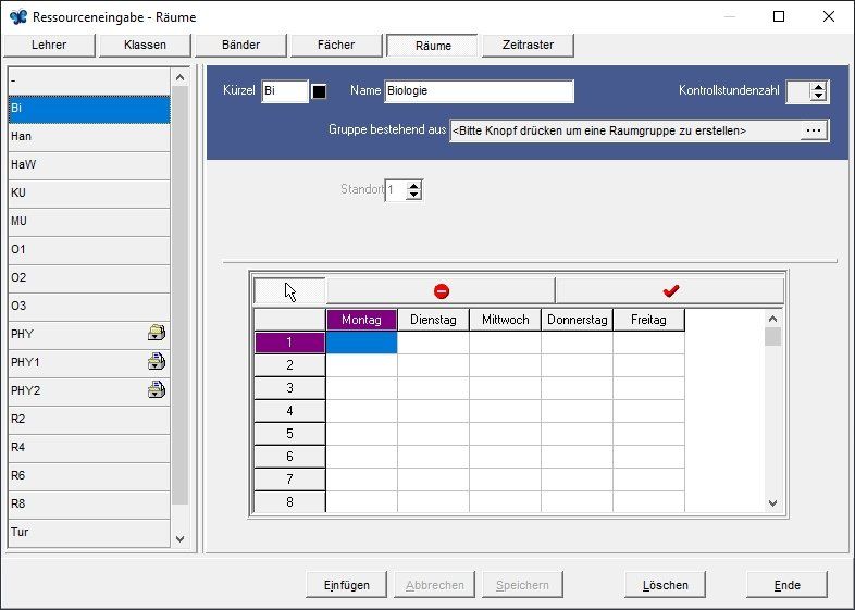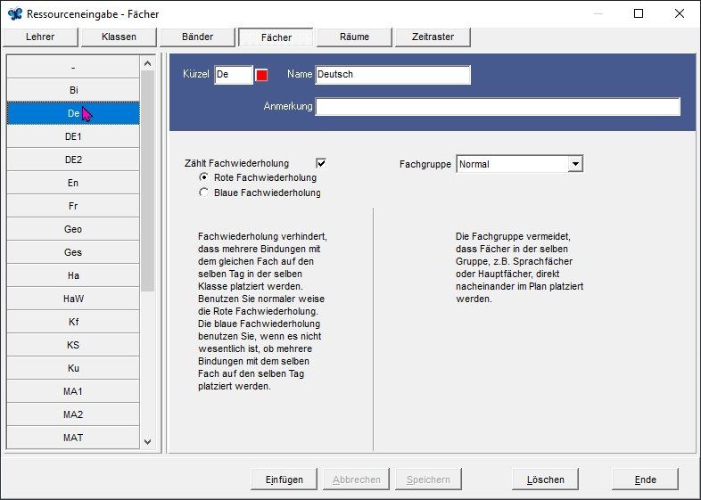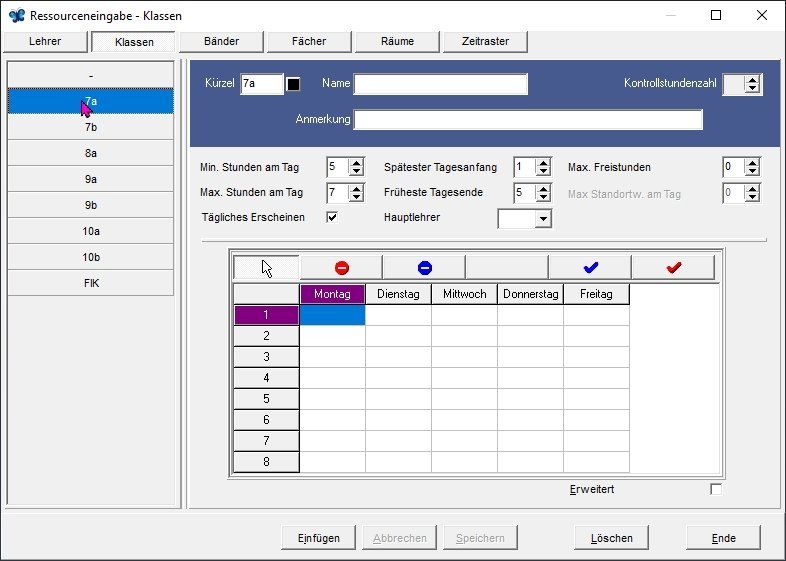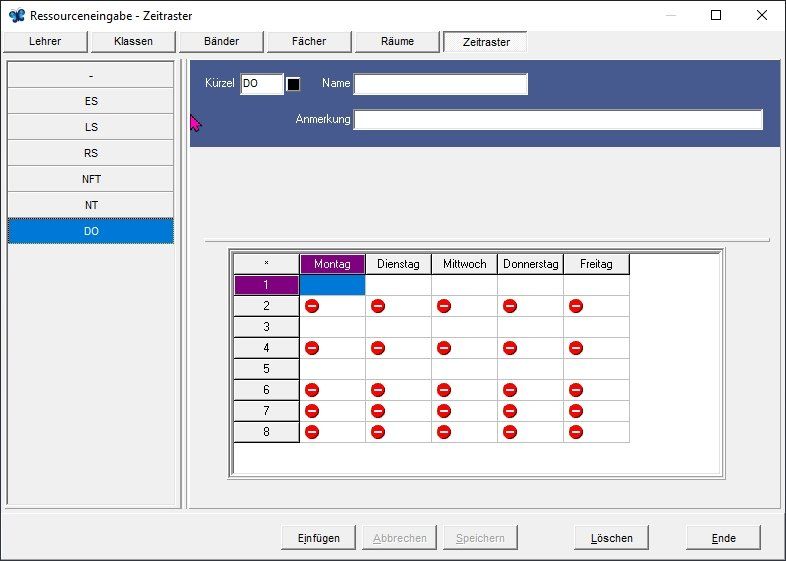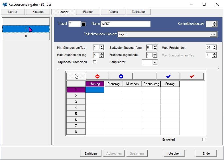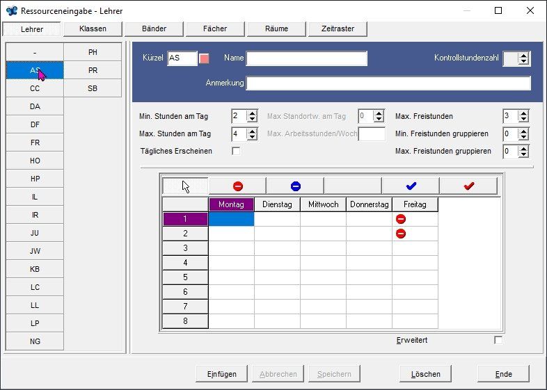 In dieser Maske werden die Zeitwünsche von Lehrern eingegeben. Hinweis: Nicht alle Zeitwünsche von Lehrkräften können verwirklicht werden. Absoluten Vorrang müssen die unabdingbaren Zeitwünsche für Seminare etc. haben. Freie Tage können auch bei den Bindungen flexibel eingegeben werden, was sich in der Praxis bewährt hat.